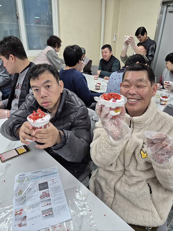 20251224_크리스마스파티&12월 이용자 생일 페이지 정보 작성자 예향 작성일26-01-20 17:30 조회198회 댓글0건 이전글 다음글 목록 본문 직업적응훈련 크리스마스파티 & 12월 이용자 생일 진행 하였습니다. 컵케익을 만드는 즐거움과 내가 만든 달콤한 케익을 맛보는 기쁨으로 크리스마스를 즐겼습니다~~^^ 댓글목록 등록된 댓글이 없습니다. 이전글 다음글 목록